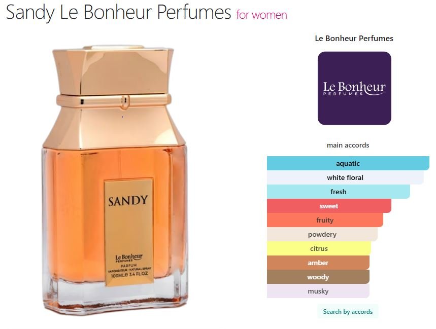 Sandy by Le Bonheur Perfumes is a Floral Fruity fragrance for women. This is a new fragrance. Sandy was launched in 2024.